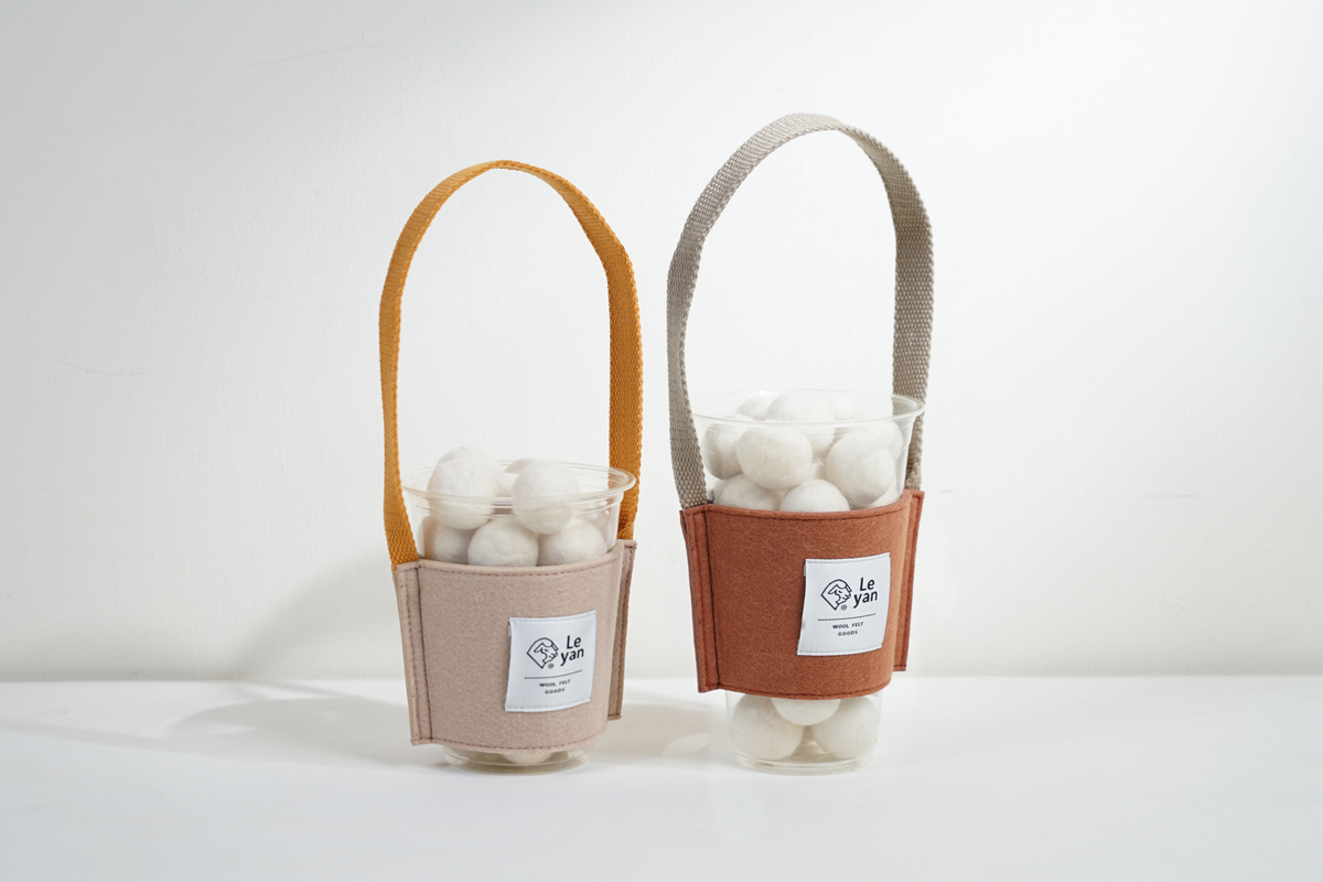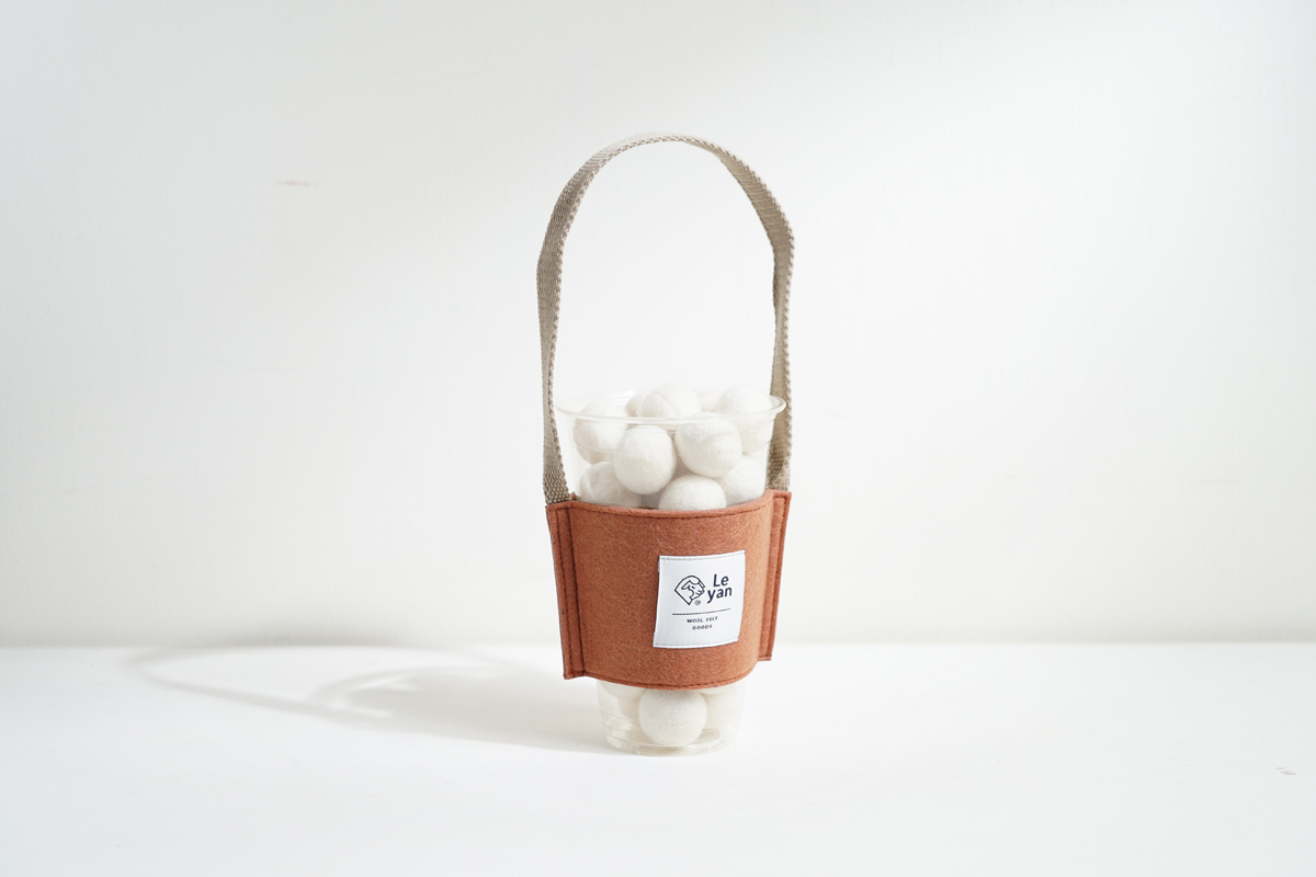 用「提了就走飲料提袋」來替代塑膠袋,提在手上,變成服裝搭配的一部分,厚厚的毛氈幫你吸乾飲料落下的水珠,不管是大杯還是小杯的手搖杯、咖啡杯都放得下唷!